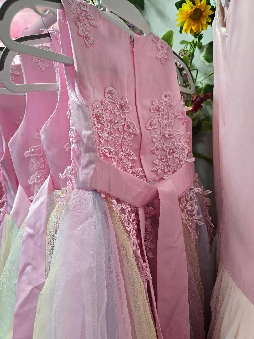 Our complimentary client closet features a pink Rainbow dress with lace and some sparkles as pictured.
